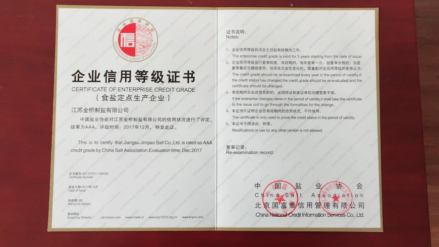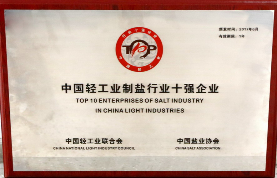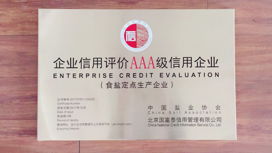 按照主營業(yè)務收入、利潤、主營業(yè)務收入利稅率及主營業(yè)務增速四項指標評價,2016年集團公司被中國輕工業(yè)聯合會和中國鹽業(yè)協會評為中國輕工業(yè)制鹽行業(yè)十強企業(yè)。根據《社會信用體系建設規(guī)劃綱要(2014—2020)》,經第三方專業(yè)評價機構和中國鹽業(yè)企業(yè)信用等級評價委員會審核并向社會公示,2016年江蘇金橋制鹽有限公司被評為AAA級食鹽生產企業(yè)。