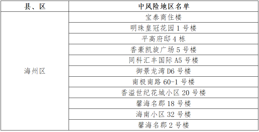 根據(jù)國務(wù)院聯(lián)防聯(lián)控機(jī)制有關(guān)規(guī)定,經(jīng)市指揮部研究決定,自發(fā)布之日起,對我市部分區(qū)域疫情風(fēng)險等級進(jìn)行調(diào)整:海州區(qū)同科匯豐國際C10號樓、紫金公館3號樓、興業(yè)時代花園B6號樓、興業(yè)時代花園C6號樓、九龍城市樂園77號樓、明珠皇冠花園20號樓、華潤公寓、雙龍村澗西隊65號、眾興華庭10號樓、壹品國際C區(qū)、香溢世紀(jì)花城小區(qū)2號樓、明珠皇冠花園11號樓、小學(xué)路11-1號樓、兆隆城市洋房A號樓、振興小區(qū)2號樓、易居公館4號樓、浦潤花園4號樓由中風(fēng)險地區(qū)調(diào)整為低風(fēng)險地區(qū)。其他地區(qū)風(fēng)險等級不變。調(diào)整后全市現(xiàn)有11個中風(fēng)險地區(qū)。