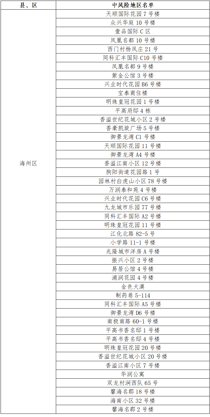 根據(jù)國務(wù)院聯(lián)防聯(lián)控機制有關(guān)規(guī)定,經(jīng)市指揮部研究決定,自發(fā)布之日起,對我市部分區(qū)域疫情風(fēng)險等級進行調(diào)整:海州區(qū)中央華府D1棟、玉蘭國際5號樓、福園名邸3號樓、一品苑44號樓、博威江南明珠苑33號樓、如佳賓館(霞輝路店)、鳳祥銘居7號樓、蒼梧春曉23號樓、龍河小區(qū)25號樓、鷹游水岸花園5號樓、海南小區(qū)34號樓、仕方國際9號樓、茗馨花園18號樓、梧桐藍山晴園7號樓、富強路疏導(dǎo)點旁三合院、百達菲力酒吧、通灌南路66號3棟、極美公寓4號樓、路南街道河運路35號樓、海連中路151號、興城四號公寓8號樓、青年路55號5棟、東方領(lǐng)秀7號樓、寶翔財富廣場3號樓、園林村白虎山組王莊隊13號、津華苑小區(qū)A2號樓、盛世豪庭小區(qū)8號樓、許莊村楊圩北隊51號、振興公寓6號樓、建欣路1號樓、園林村白虎山小區(qū)100號、路南街道東村巷2號樓、建設(shè)中路76-24號由中風(fēng)險地區(qū)調(diào)整為低風(fēng)險地區(qū)。