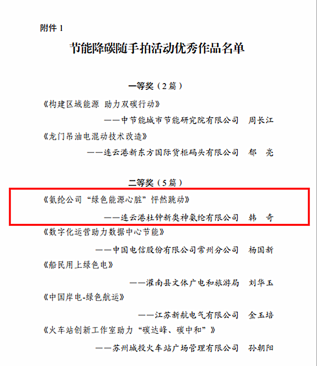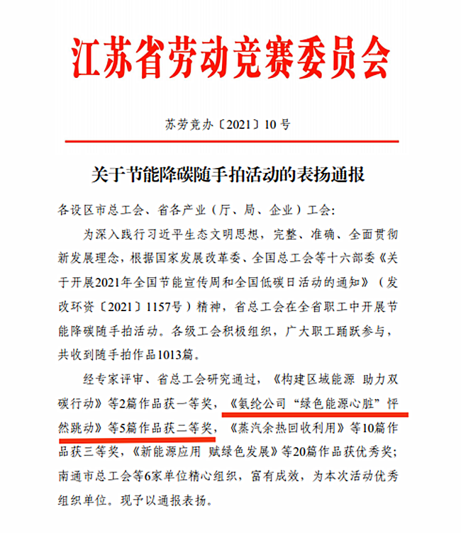日前,江蘇省總工會在全省職工中開展節(jié)能降碳隨手拍活動評選結(jié)果正式公布,杜鐘氨綸公司《氨綸公司“綠色能源心臟”怦然跳動》榮獲二等獎。