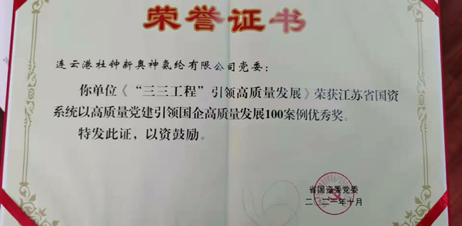 日前,杜鐘氨綸公司《“三三工程”引領(lǐng)高質(zhì)發(fā)展》榮獲江蘇省國(guó)資系統(tǒng)以高質(zhì)量黨建引領(lǐng)國(guó)企高質(zhì)量發(fā)展100案例優(yōu)秀獎(jiǎng)。