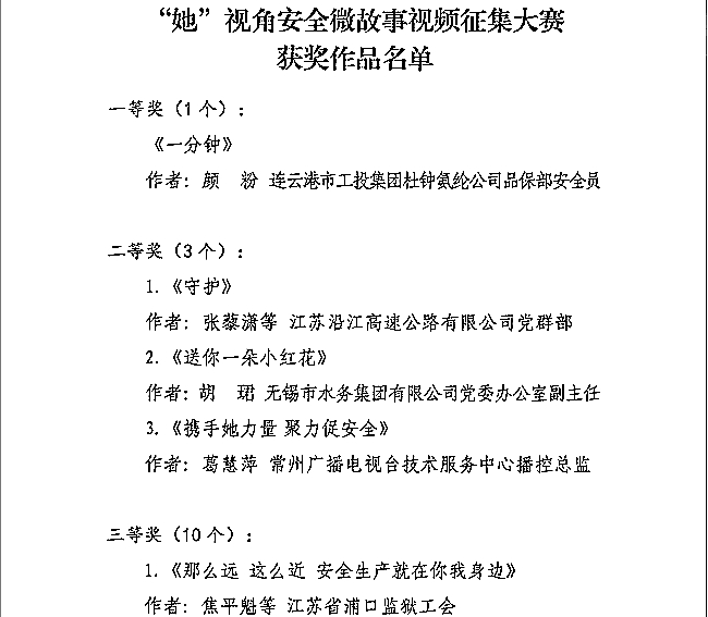 日前,江蘇省總工會開展以“攜手她力量 暖心聚力促安全”為主題的“她”視角安全微故事視頻大賽評選結(jié)果正式公布,公司選送的《一分鐘》安全微故事榮獲大賽一等獎。