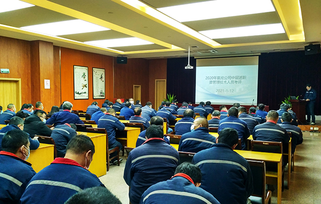 1月12日上午,氨綸公司2020年度中層管理人員述職暨管理技術(shù)人員考評(píng)會(huì)議在一樓多功能廳舉行。公司管理及技術(shù)人員100余人參加了會(huì)議。