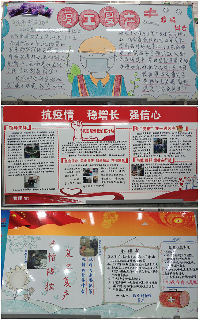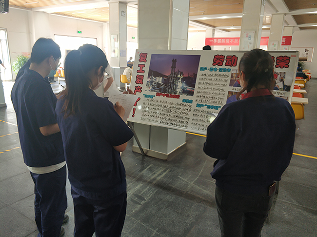 5月21日,公司開展了以“抗疫情•復(fù)工復(fù)產(chǎn)”為主題的板報評比活動。來自生產(chǎn)一部、生產(chǎn)二部、品保部、公用工程部、生產(chǎn)設(shè)備部、技術(shù)研發(fā)部以及管理部門的7個部門參加了評比。