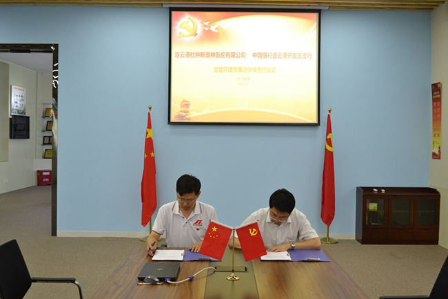 中行開發(fā)區(qū)支行與杜鐘氨綸公司有著良好的合作淵源,雙方以此為契機,相互學(xué)習(xí),加強互動,共同提高,推動黨建共建及廉潔共建各項工作。同時希望建立長效的、全方位的溝通交流機制,通過黨建共建促進業(yè)務(wù)創(chuàng)新發(fā)展,實現(xiàn)雙方在銀團貸款、貿(mào)易結(jié)算等方面的廣泛合作。隨后,雙方共同簽署了《黨建共建暨廉潔伙伴協(xié)議書》,拉開了合作序幕。
