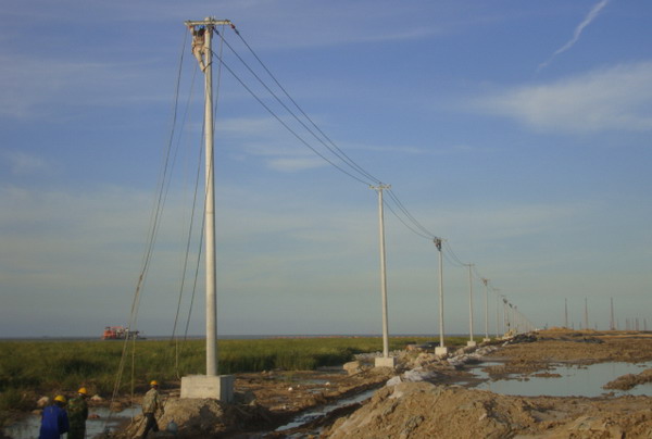 連云新城三期供電線路緊貼海堤邊。受海堤建設(shè)進(jìn)度和海風(fēng)海潮的影響,低矮的壩堤經(jīng)常被風(fēng)刮起的海浪浸頂,石塊突起,洼水漣漪,淤泥纏足,堤邊路面凹凸不平,道路僅限一輛車通行,擁擠不堪,工程施工難度極大。為提升速度,加快進(jìn)度,臺北供電所克服困難,緊鑼密鼓地展開工作,以期早日完工?,F(xiàn)場勘察地形地貌,了解潮汐運動規(guī)律,制定施工計劃,設(shè)計措施方案,組織人力,采購材料,投入施工。施工人員采用彈性工作時間,利用落潮時機,搶運電桿,及時立桿和裝配。職工們發(fā)揚不怕苦,不畏難的精神,不懼海風(fēng)吹臉、海水浸衣,爬上距離海平面二十多米仿佛搖擺不定的高桿,懸在空中一絲不茍地操作,保障了工程的全面竣工。