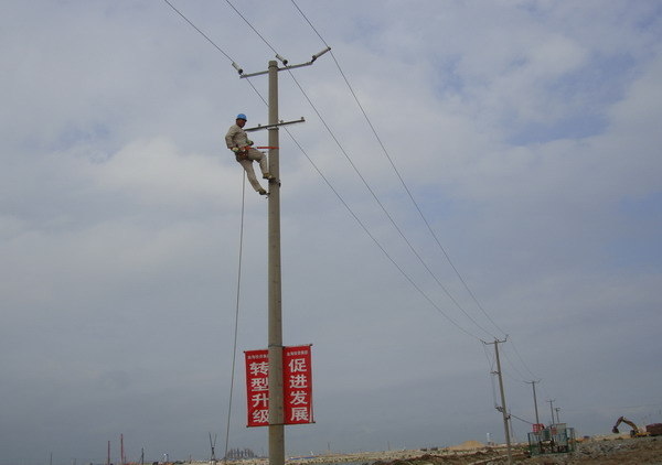 8月27日,該所接到連云新城建設指揮部通知,要求在施工道路沿線全部架設臨時路燈,并在8月31日完成,以加快新城工程建設進度。這需要在短短三天內安裝60盞路燈、架設3000米照明線路與部分電桿。該所領導班子既感受到新城建設指揮部領導的信任,又深感任務的艱巨。面對人員少、工程急、施工地形復雜等困難,該所安排人員抓緊制定方案,準備材料,并積極組織人力,除留下變電所和電費收繳值班人員外,其余人員全體出動。一場與時間賽跑、與困難抗爭的會戰(zhàn)在連云新城建設工地上拉開了序幕。