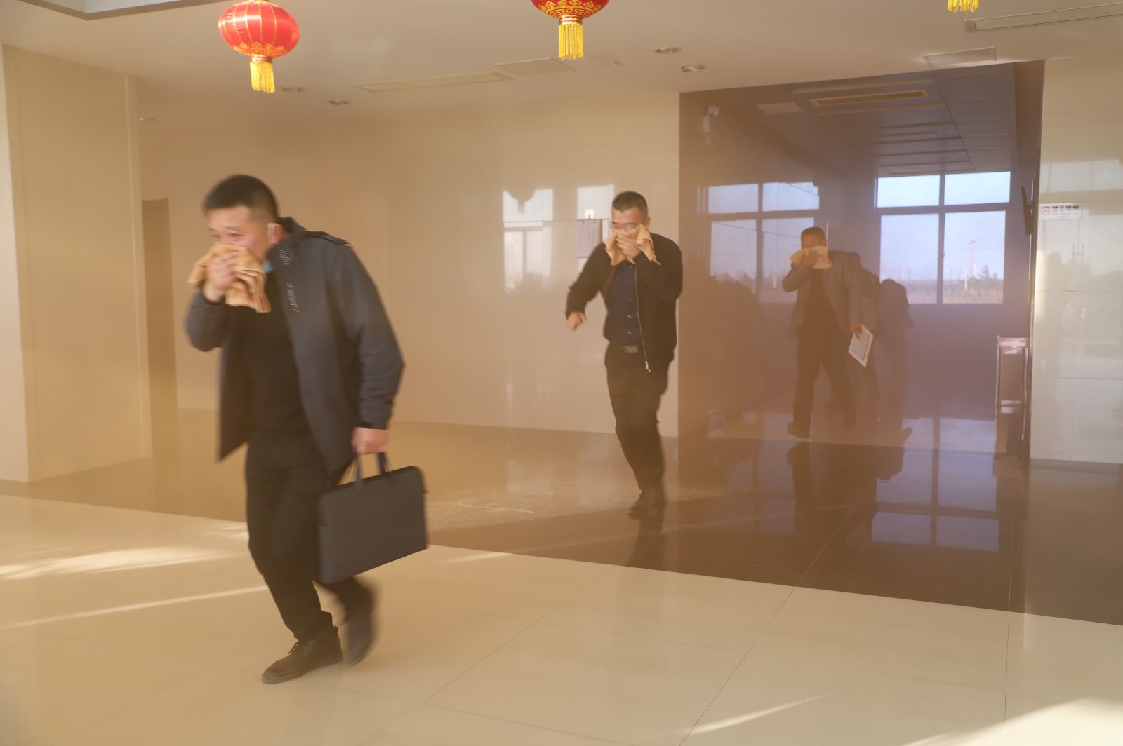 此次實(shí)戰(zhàn)演練的“突發(fā)事件”地點(diǎn)設(shè)在機(jī)關(guān)大樓,所有參訓(xùn)人員按照既定的消防應(yīng)急預(yù)案進(jìn)行了一次消防安全模擬演練。隨著“消防警報(bào)聲”響起,正在大樓內(nèi)工作的員工在濃煙中用濕巾捂嘴、彎腰、靠墻從樓梯道口迅速有序地疏散、撤離,在假定火災(zāi)發(fā)生條件下進(jìn)行逃生自救實(shí)戰(zhàn)演練。救援組、疏散組、后勤組各組成員各負(fù)其職,配合有序,隨后,大家在樓前廣場上進(jìn)行了滅火器實(shí)戰(zhàn)操作訓(xùn)練。