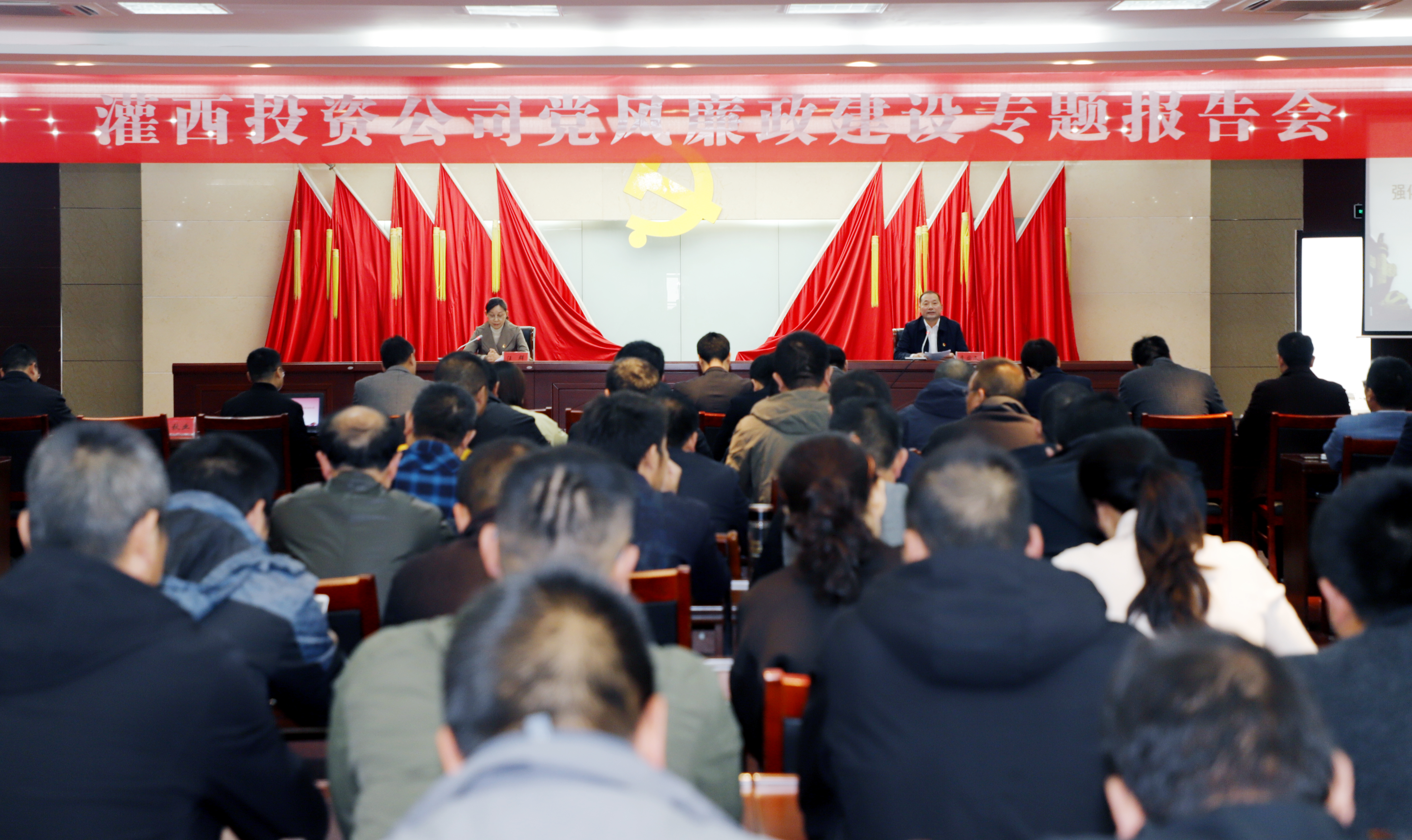 11月17日下午,灌西投資公司邀請(qǐng)集團(tuán)紀(jì)委書(shū)記汪群在機(jī)關(guān)五樓會(huì)議室為黨員干部作黨風(fēng)廉政建設(shè)專(zhuān)題報(bào)告。投資公司黨委書(shū)記、董事長(zhǎng)、總經(jīng)理李國(guó)文主持會(huì)議,公司領(lǐng)導(dǎo)班子成員、各單位黨政負(fù)責(zé)人、共建單位神特、奧神紀(jì)檢人員、機(jī)關(guān)全體管理人員100余人參加會(huì)議。