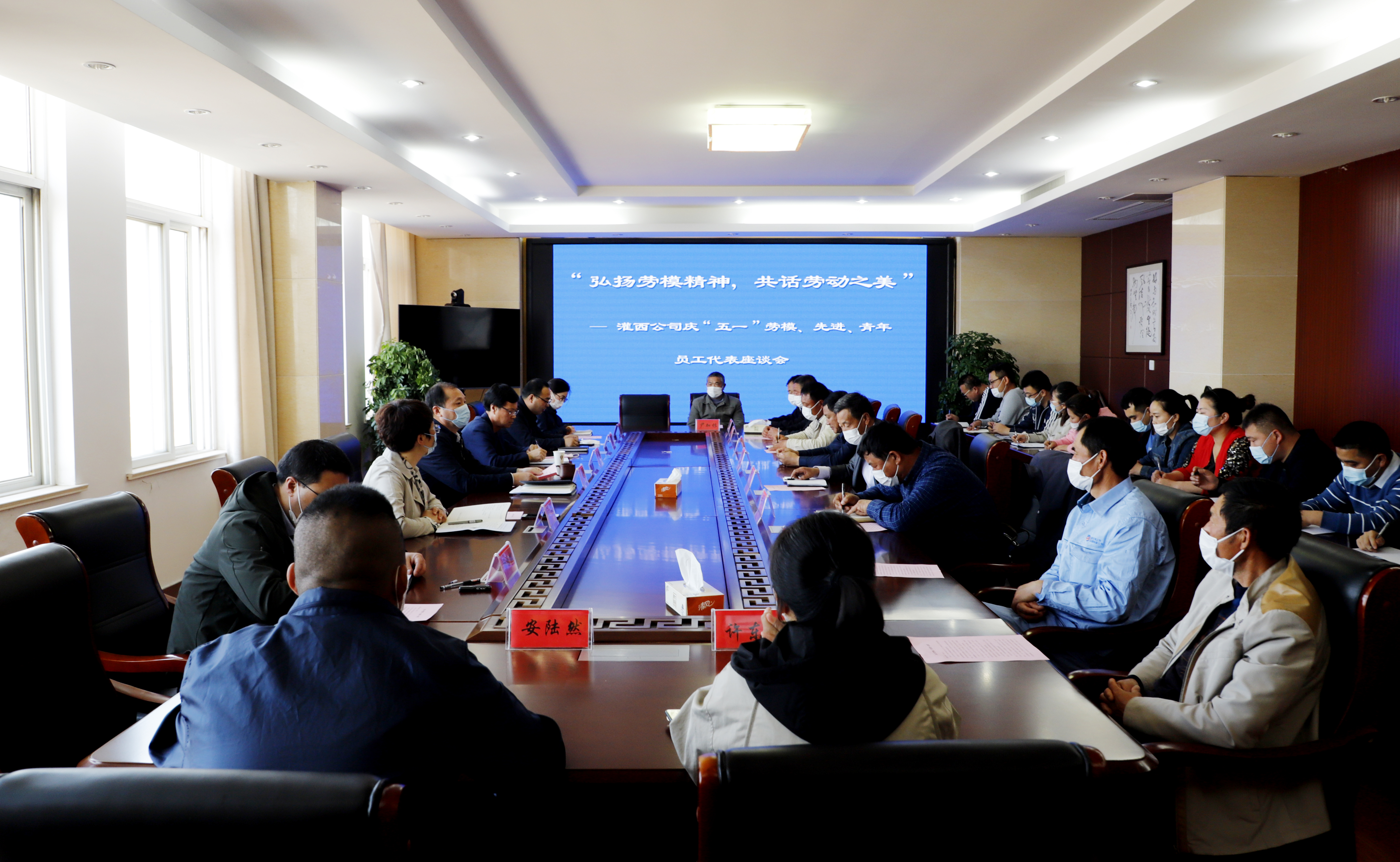 為慶祝“五一”國際勞動節(jié),進一步弘揚勞模精神和勞動精神,為公司的高質(zhì)量發(fā)展提供精神動力。4月29日下午,灌西公司在機關(guān)三樓會議室召開慶“五一”勞模座談會。黨委書記、董事長、總經(jīng)理李國文,常務(wù)副總經(jīng)理古浩光,黨委副書記、紀委書記、工會主席王宏以及來自公司各條戰(zhàn)線的勞動模范、先進、青年員工代表40余人參加座談會。