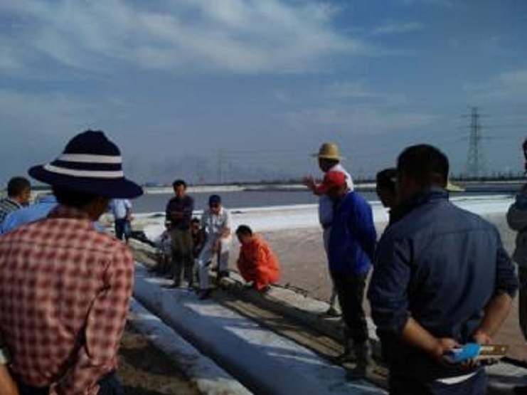 該分公司一班人帶著十六名班長,到新河零班做加鹵“天溝”工作現(xiàn)場。剛到目的地,站在打好的溝頭,一眼望去,二條溝口線筆直,和熟捯實的粘埝泥輕而易舉承載著人的重量。此條加鹵“天溝”嚴格按日曬制鹽公司規(guī)格標準而建,溝長約210米,上口寬55cm,下口寬30cm,溝深45cm,溝底坡勢順沿三排到頭排由淺至深。做好的一條加鹵溝, 可以為六塊結(jié)晶池扒鹽期間分別添加鹵水,減少洗鹽鹵水進其它池塊的二次污染。
