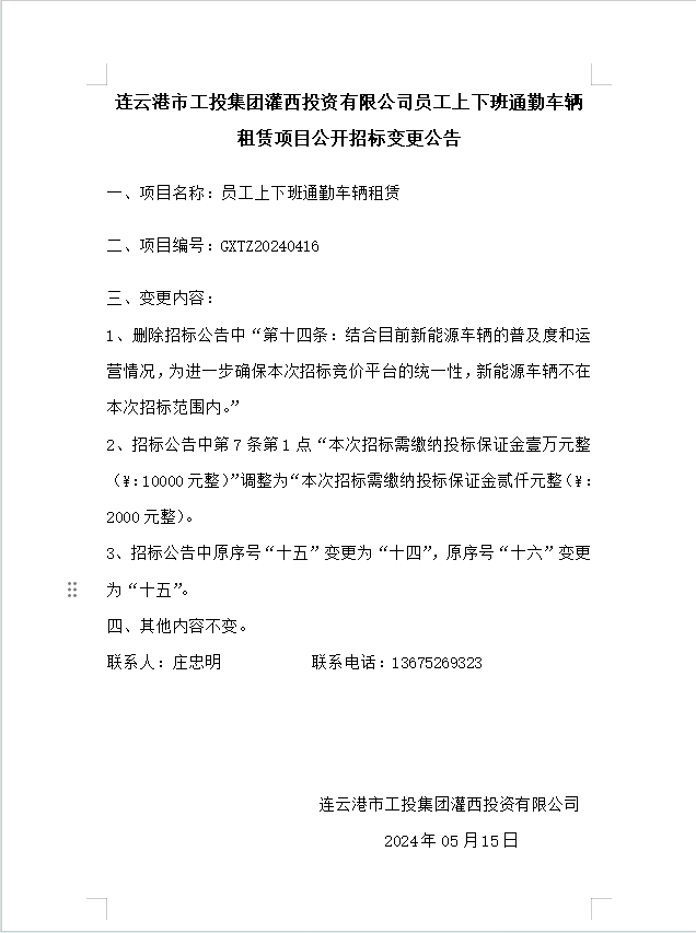 連云港市工投集團(tuán)灌西投資有限公司員工上下班通勤車(chē)輛租賃項(xiàng)目公開(kāi)招標(biāo)變更公告
