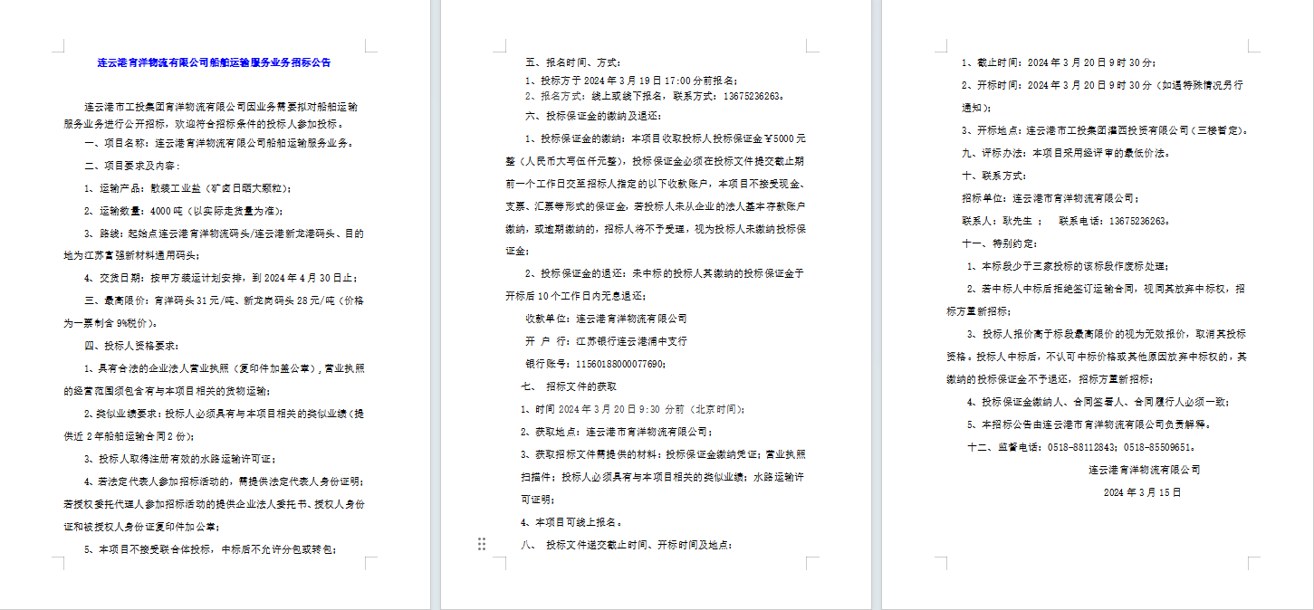 連云港宵洋物流有限公司船舶運輸服務業(yè)務招標公告