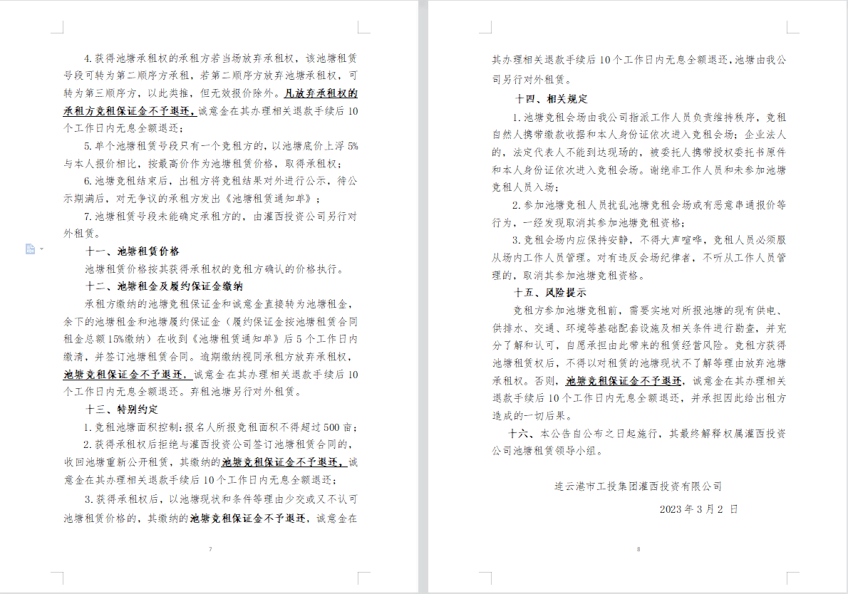 連云港市工投集團(tuán)灌西投資公司2023年度淡水養(yǎng)殖池塘公開競(jìng)租公告
