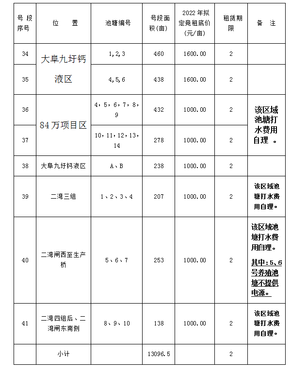 根據(jù)連云港市工業(yè)投資集團(tuán)有限公司關(guān)于資產(chǎn)租賃相關(guān)文件精神的要求及本公司淡水養(yǎng)殖池塘實(shí)際情況,經(jīng)灌西投資公司池塘租賃領(lǐng)導(dǎo)小組研究,報(bào)請(qǐng)集團(tuán)公司同意,2022年現(xiàn)對(duì)下述養(yǎng)殖池塘公開(kāi)對(duì)外競(jìng)租。