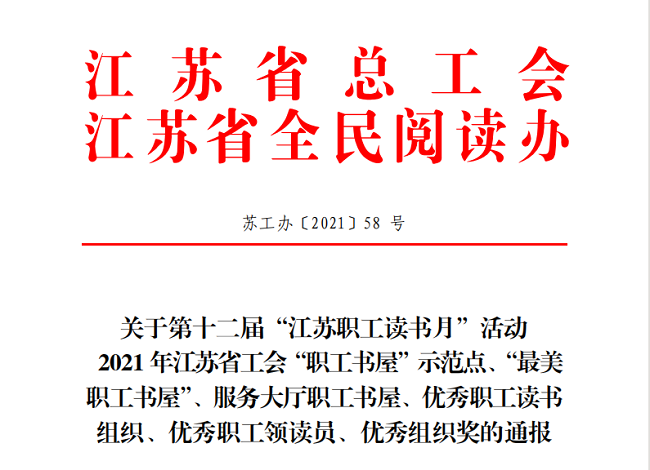近日,江蘇省總工會、江蘇省全民閱讀辦聯(lián)合下發(fā)《關于第十二屆“江蘇職工讀書月”活動通報》(蘇工辦【2021】58號)文中,我公司職工書屋獲評2021年度江蘇省工會“職工書屋”示范點,同時獲贈圖書近200冊。