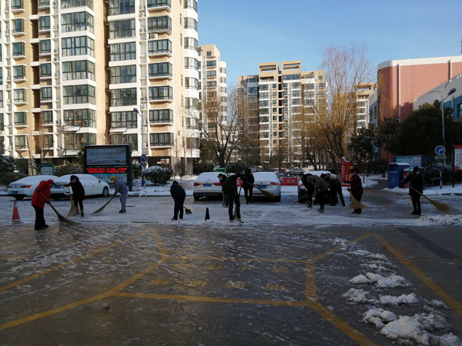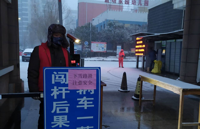 作為公司職工居住的鹽場(chǎng)家園小區(qū),按照金海社區(qū)要求,執(zhí)行封閉管理,每戶只發(fā)一個(gè)通行證,除門(mén)衛(wèi)外,管理人員全部參與輪流值班。特殊天氣時(shí),大門(mén)的看守更加嚴(yán)格與認(rèn)真,值班人員對(duì)過(guò)往的人員登記、量體溫,確保沒(méi)有問(wèn)題后才給與放行。大雪洋洋灑灑,清晨的鹽場(chǎng)家園銀裝素裹,泰祥物業(yè)的工作人員,佩戴好口罩,拿著掃帚彎著腰,揮動(dòng)手中的工具在清理積雪。雪已結(jié)成冰,但他們不畏寒冷,堅(jiān)毅有力,鏟掉冰凍。寒冷的天氣,絲毫沒(méi)有影響大家的熱情,先主路后支路,逐漸掃出一條整潔的路面,疫情面前,泰祥物業(yè)人用行動(dòng)用嚴(yán)格用責(zé)任溫暖了業(yè)主的心。