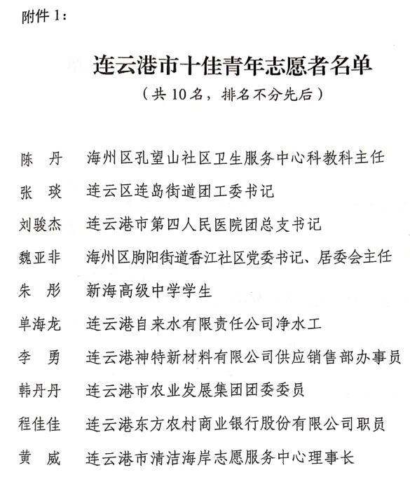 近日,公司員工李勇被共青團連云港市委、連云港市文明辦、連云港市志愿者協會授予“連云港市十佳青年志愿者”稱號。這是對其“無償獻血,大愛無疆”的肯定,也是對其一種激勵。