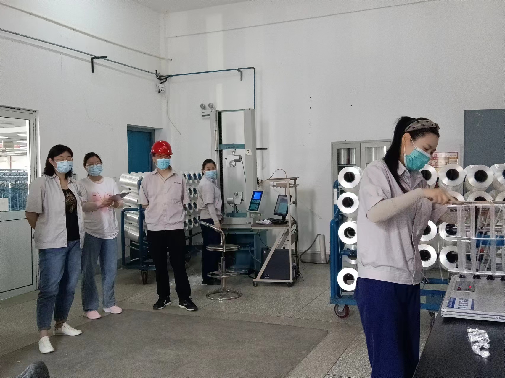 上午9:30,物檢班組緊接著開始比賽。纖度檢測首先上場的是王玉梅同志,掛絲、繞絲、打結(jié)、稱重有條不紊的完成了比賽。強(qiáng)度檢測比賽中侯義芹同志第一個(gè)出場,以幾乎完美的表現(xiàn)完成了比賽。經(jīng)過激烈的角逐,王娟同志以4分10秒05獲得了纖度檢測第一名,侯義芹同志1分51秒14獲得強(qiáng)度檢測第一名 。