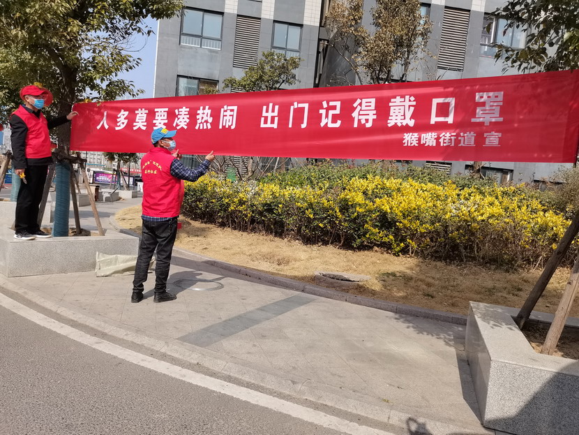 ▲昌圩社區(qū)臨時(shí)黨支部書(shū)記李明,黨員骨干于洪亮懸掛疫情宣傳標(biāo)語(yǔ)。