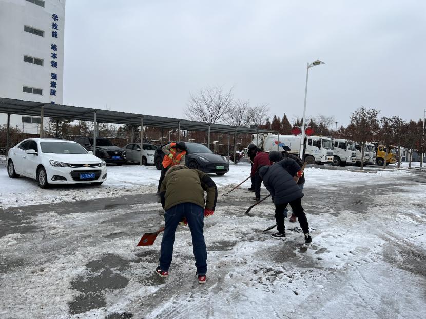 在清理工作現(xiàn)場,該公司負責人趙陽帶領黨員干部攜帶各種除雪工具,先后來到各自的責任區(qū)開始清除積雪,有的奮力潑灑融雪劑;有的拿著大板鍬,推著積雪露出一道道干凈的路面;有的在寒風中不停地揮舞著手中的鐵锨,使勁清理著被汽車壓結實的冰渣;有的將積雪一點點地集中到一起,然后用掃帚掃凈路面,大家你鏟我掃,團結協(xié)作,干勁十足,一片熱火朝天的除雪景象。