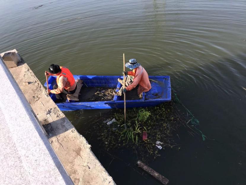 作業(yè)過程中,打撈人員因地制宜,采取分段清理、圍攔堵截、水上打撈等方式進(jìn)行打撈,有的坐在船上用濾網(wǎng)、鉤耙等工具清理河面雜草,有的在岸邊將水草打撈上岸,并其進(jìn)行集中處置,防止對(duì)河道造成二次污染。通過3個(gè)多小時(shí)的清理打撈,河道中的水流恢復(fù)暢通。