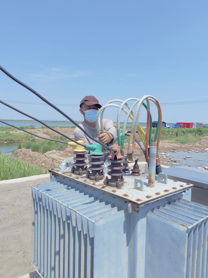10時(shí)40分搶修工作全面展開,當(dāng)天地下氣溫接近38度,塔臺(tái)上氣溫接近50度,變壓器上燙的要命,人在上面只是感覺熱浪滾滾,電工尹永明身上衣服很快被汗水濕透,太陽暴曬,如火的驕陽絲毫沒有阻擋施工進(jìn)度,一切工作都進(jìn)行的繁忙有序,井井有條。中午12時(shí)30分經(jīng)過近2個(gè)小時(shí)的搶修,工作人員完成了變壓器的維修任務(wù),保證了魚塘用電設(shè)備的正常運(yùn)轉(zhuǎn)。