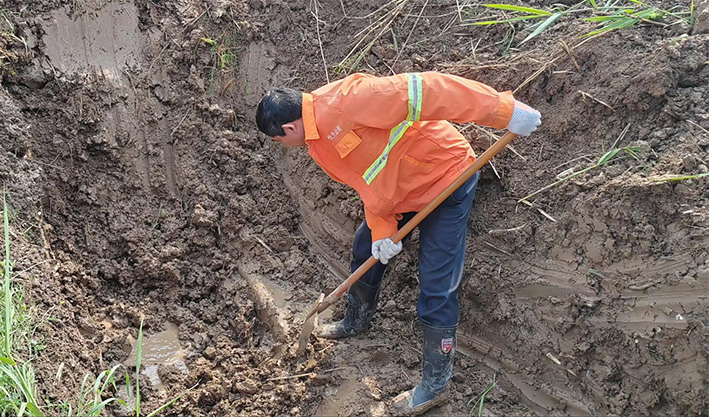 市政分公司組織搶修人員迅速到場(chǎng),調(diào)集挖機(jī)與搶修材料,有序開(kāi)展應(yīng)急搶修。維修人員首先對(duì)漏水管道實(shí)施開(kāi)挖,經(jīng)過(guò)維修人員仔細(xì)挖開(kāi)后確定直徑110PVC管道老化導(dǎo)致管道連接端裂開(kāi)。查明原因后,制定了相應(yīng)可行的搶修方案。搶修過(guò)程中,大伙不畏困難、分工有序,相互協(xié)作,在滿(mǎn)是泥濘的坑中開(kāi)展維修作業(yè)。機(jī)械開(kāi)挖、人工配合清淤、更換損壞管道、增設(shè)哈夫節(jié)等一系列的步驟,一通操作下來(lái),搶修人員人人汗流浹背。經(jīng)過(guò)3個(gè)多小時(shí)連續(xù)奮戰(zhàn),高效完成此次搶修任務(wù)。