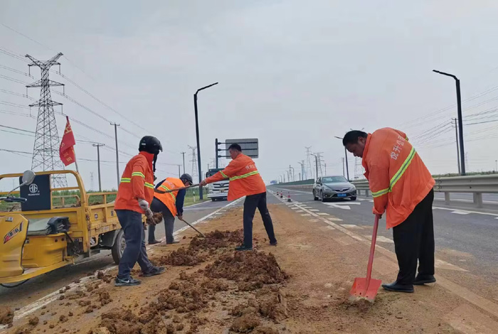 7月27日上午,臨近下班之時,該分公司228省道班長姚功,接到公司應(yīng)急處理電話,疏港大道向西路面近1500多米長,車輛拋灑嚴(yán)重影響往來車輛安全經(jīng)過。正在下班的途中他二話沒說,調(diào)轉(zhuǎn)車頭奔赴事發(fā)地點疏港大道,迅速擺開安全錐,揮動手中鐵銑開始突擊清理路面上礦土,石塊。聞訊得知此事,共產(chǎn)黨員紀(jì)樹好,胡可貴,班組成員孫洪召等同志二話沒說,一并趕往現(xiàn)場支援,橙色工作服在陽光照耀下顯得格外靚麗。工作現(xiàn)場,遇到大的石塊他們就用手搬,小的、碎的就用鐵锨和掃把清理,中午的陽光火辣辣的,他們就這樣頂著烈日奮戰(zhàn)近兩個多小時,共轉(zhuǎn)運礦土泥塊、石子近10余車,高質(zhì)高效保障了核心道路車輛安全通行。(楊波)